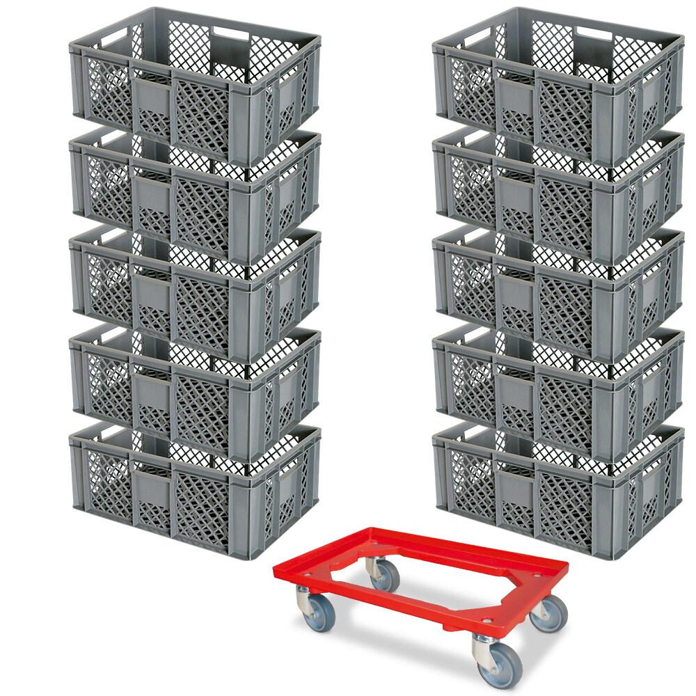 BRB 10 Euroboxen, 600x400x240 mm, grau, lebensmittelecht + GRATIS Transportroller