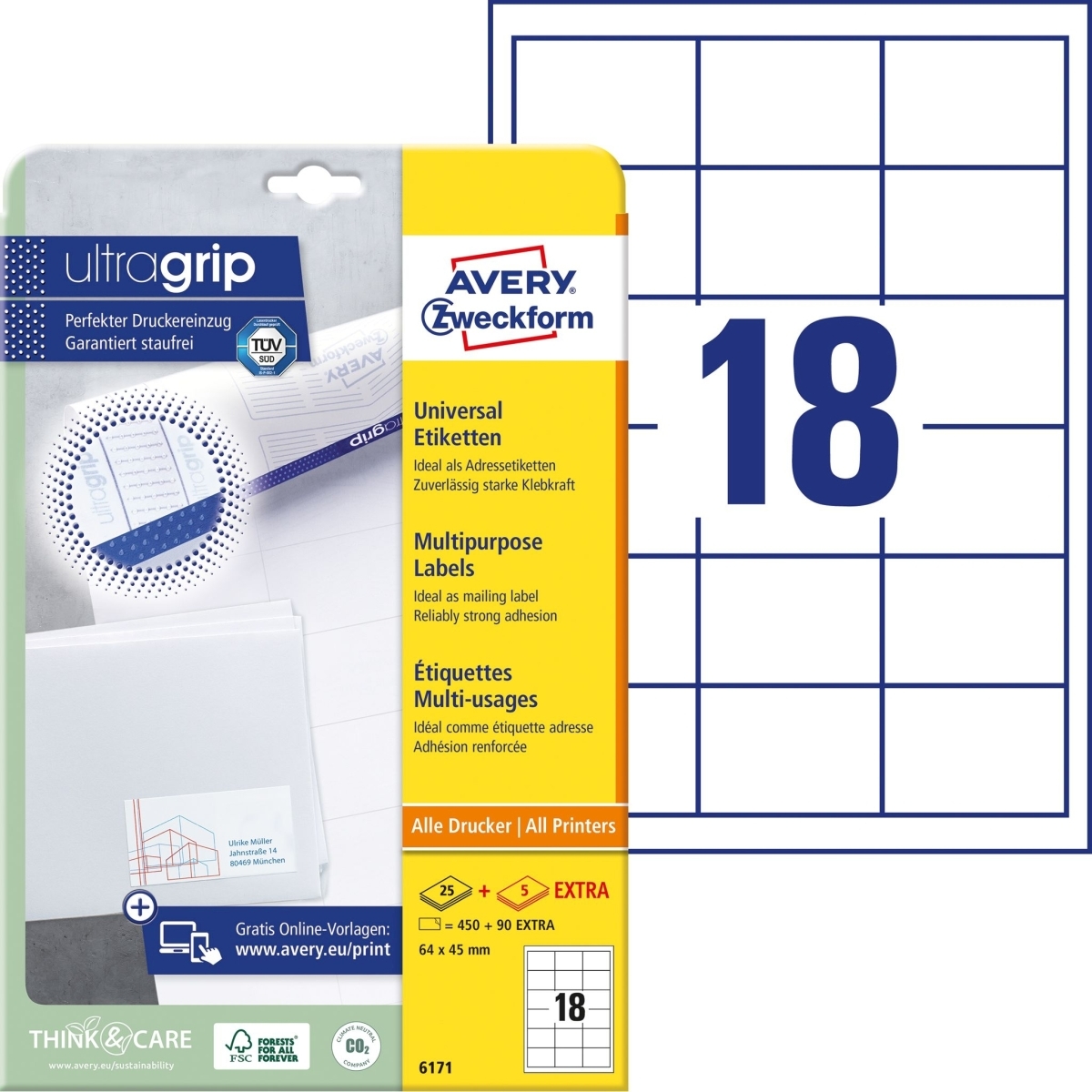 Avery Zweckform Universal-Etiketten ultragrip 64x45 mm VE=540 Etiketten / 30 Bogen weiß