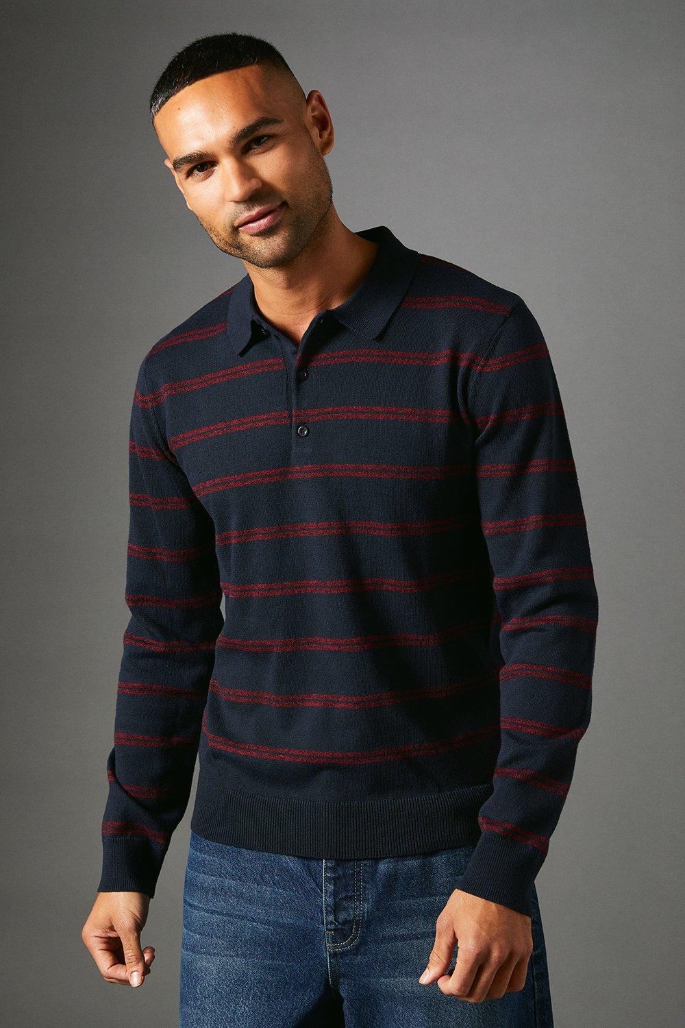 Maine Mens Stripe Long Sleeve Knitted Polo - Navy - Size Large | Maine Sale | Discount Designer Brands