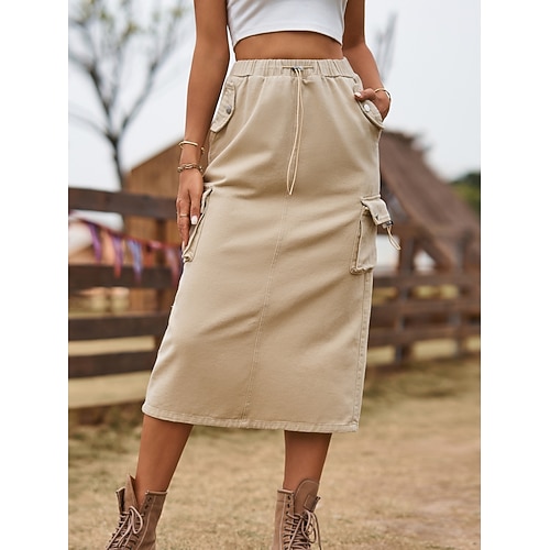 Per donna Gonna Linea A Aderente Moda Casual Midi Vita Alta Gonne Semplice Coulisse Tasca Micro-elastico Streetwear Quotidiano Nero Verde Cachi Grigio Estate Denim