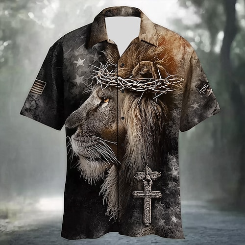 Per uomo Animale Leone Croce Templare Camicia Camicia Estiva Camicia con Bottoni Manica Corta Vintage Retrò All'aperto Vacanza Abbigliamento Quotidiano Estate Primavera Collo ripiegato Stampa 3D