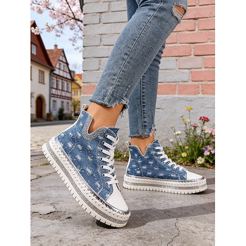 sneakers alte da donna in denim effetto consumato con suola glitterata: scarpe casual alla moda con lacci per concerti, festival e street style quotidiano