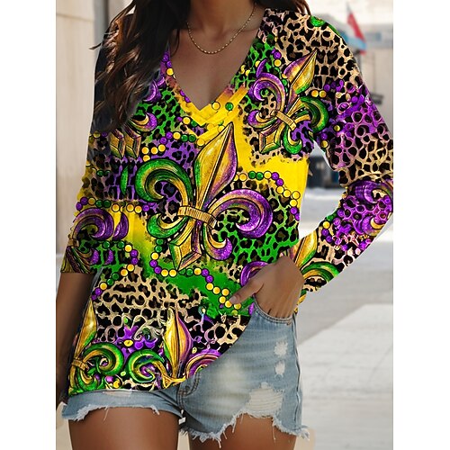 Martedì grasso Per donna Maglietta Grafico Leopardo Elegante Casual Manica Lunga Scollo a V Top Regolari Quotidiano Uscire Weekend Stampato Giallo Viola Estate Primavera