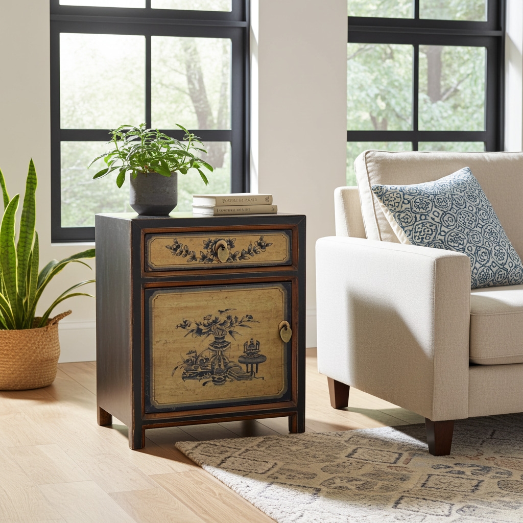 OPIUM OUTLET Möbel Kommode Nachttisch Nachtschrank Nachtkonsole Nachtkästchen 35191-1 schwarz-beige asiatisch chinesisch orientalisch