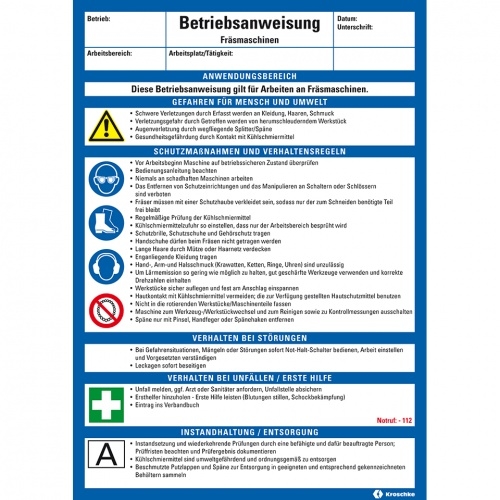 König Werbeanlagen Dreifke® Maschinenbetriebsanweisung Fräsmaschinen, Kunststoff, 210x297mm, ASR A1.3, DIN EN ISO 7010