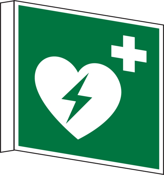 Rettungszeichen, Fahnen-/Nasenschild Defibrillator E010 - ASR A1.3 (DIN EN ISO 7010) - 200x200x1 mm Kunststoff nachleuchtend