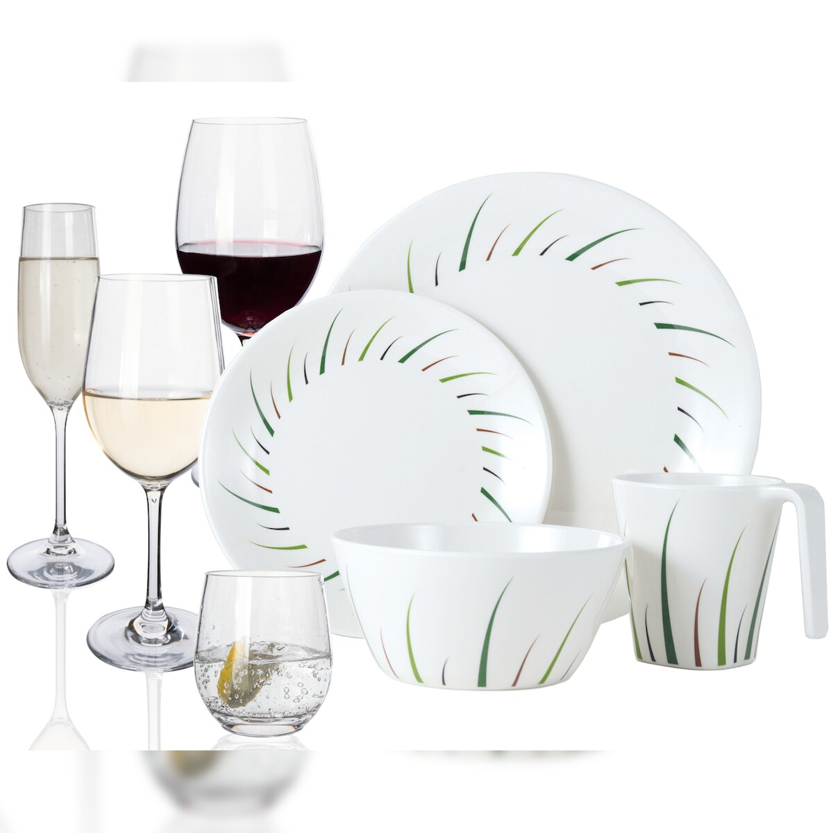 Moritz Melamin Geschirr-Set 4 Personen Limon Design 16 Teilig + 16 Gläser Wasser Weingläser Champagner Tafelgeschirr Picknick BBQ Kochgeschirr