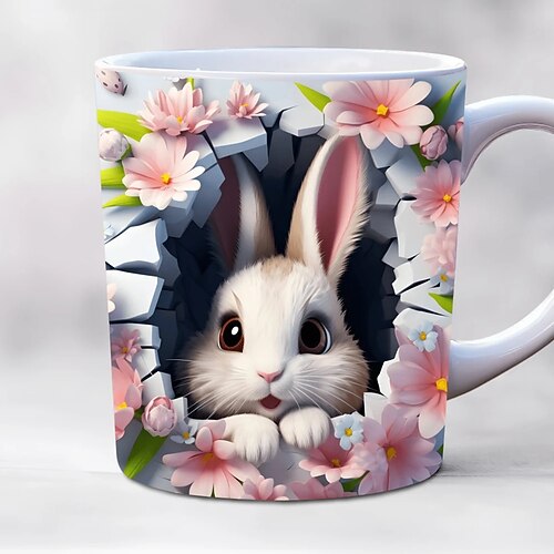 Tazza da caffè da 11 once con gatto, coniglio e uccello in 3D, tazza in ceramica isolata, riutilizzabile, lavabile solo a mano, adorabile design di animali con fiori, regalo perfetto per il caffè