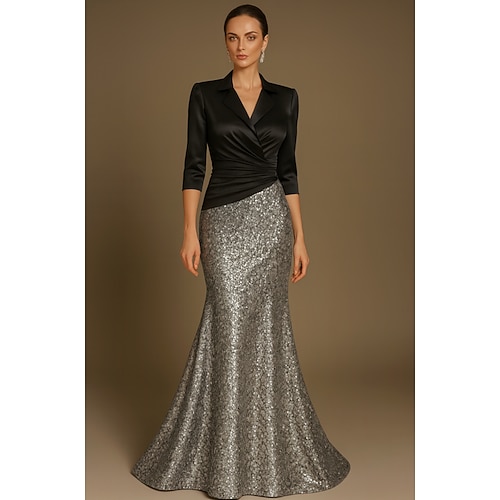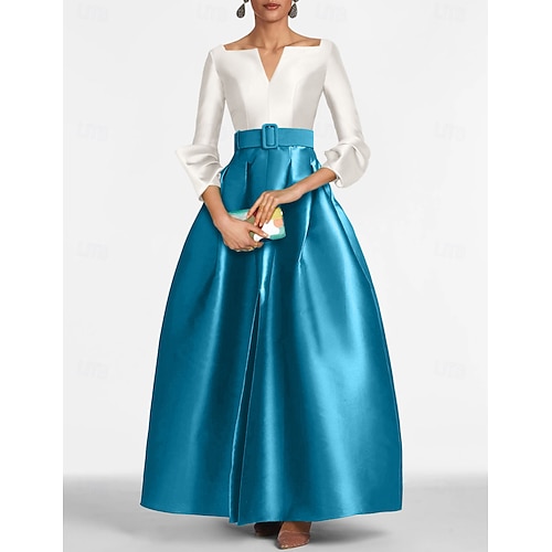 Linea ad A Lunghezza al pavimento Abito da Sera Da principessa Abito formale Elegante Setoso Manica 3/4 Scollo a V Cravatta nera Tasca Raso con Spacco