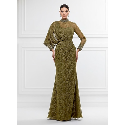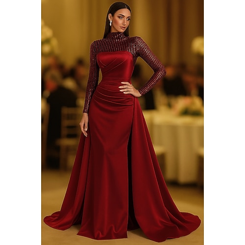 Linea ad A Lunghezza al pavimento Abito da Sera Abito da ballo con sopragonna Elegante Scintillante Manica Lunga Collo Alto Matrimonio Formale Tasca Raso Con Paillettes con Glitter Pieghe