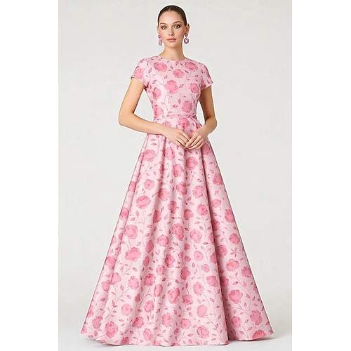 Linea ad A Lunghezza al pavimento Abito da Sera Da principessa Abito formale Elegante Setoso Manica Corta Girocollo Matrimonio Formale Tasca Raso con Stampa floreale