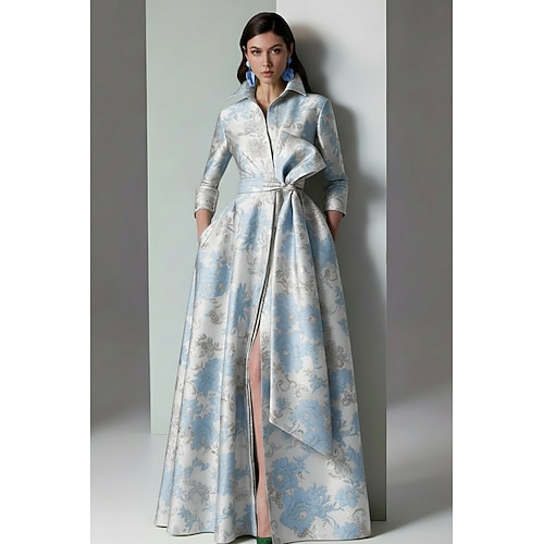Linea ad A Lunghezza al pavimento Abito da Sera Elegante Scintillante Setoso Manica Lunga Colletto a Camicia Festa in giardino Matrimonio Tasca Jacquard con Stampa floreale Fiocco/Fiocchi Spacco