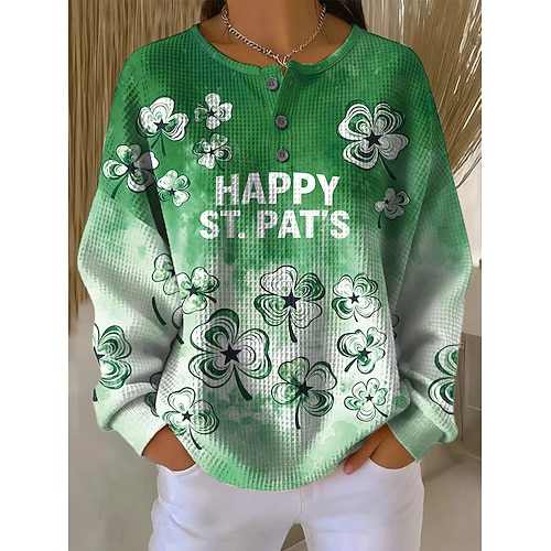 Felpa da donna di San Patrizio con grafica Quadrifoglio calda classica casual maniche lunghe girocollo tops regolari abbigliamento casual stampa a bottoni verde