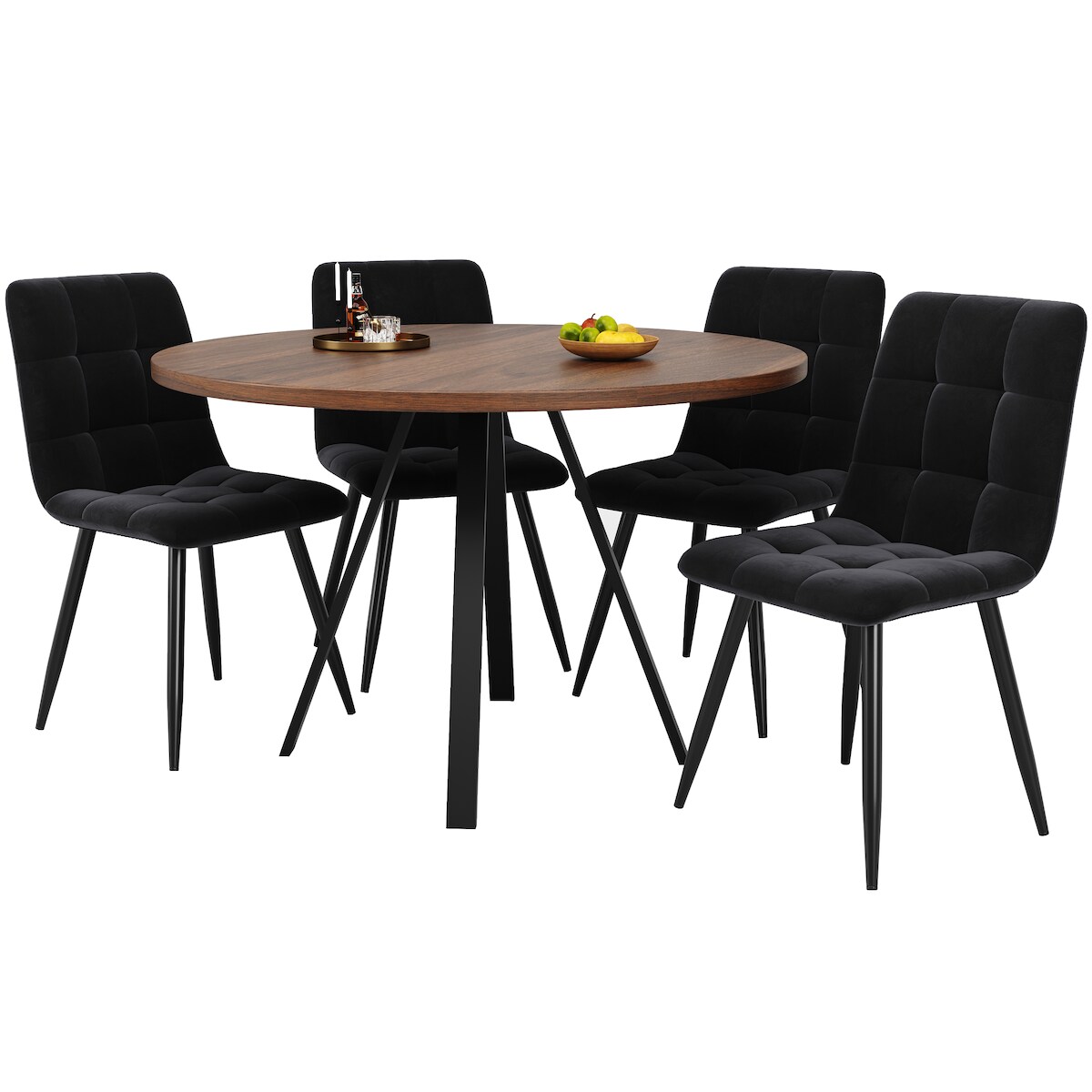 STILVORA Essgruppe 5 tlg Esstisch rund 80x80x75 cm mit 4 Samt Esszimmerstühlen Schwarz, MDF Tischplatte Walnussoptik, Metallgestell