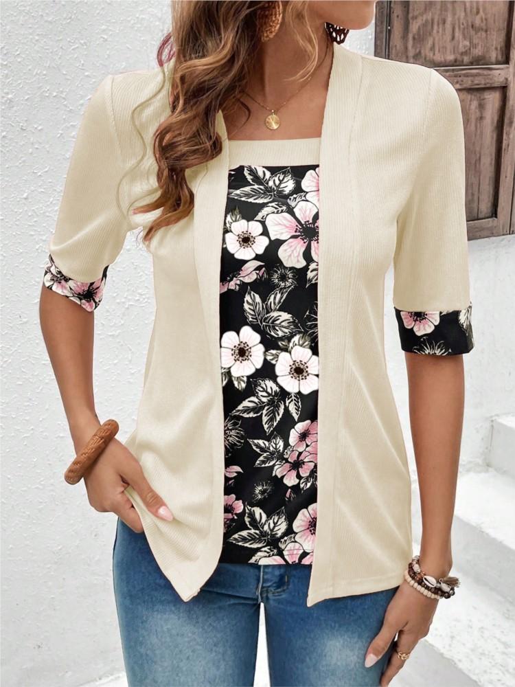 2025 T Shirts Women Fake Two Piece Set Elegant Patchwork Fake Two Piece Shirts Summer Casual Print Half Sleeve Ladies Loose Tops cm gray