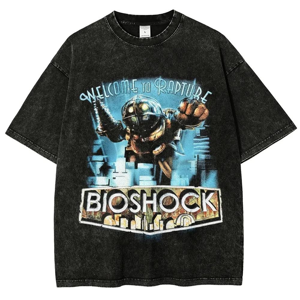 Classic Retro Shooting Game Bioshock Peripherals Graphic Print T-shirt Men Women New Harajuku Wind Tee Vintage Washed Cotton Top cm grey