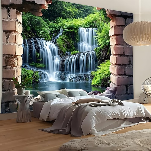 Arazzo con cascata, natura, giungla, paesaggio, muro rotto, 3D, murale realistico, foresta tropicale, per soggiorno, sala yoga, spazio per la meditazione