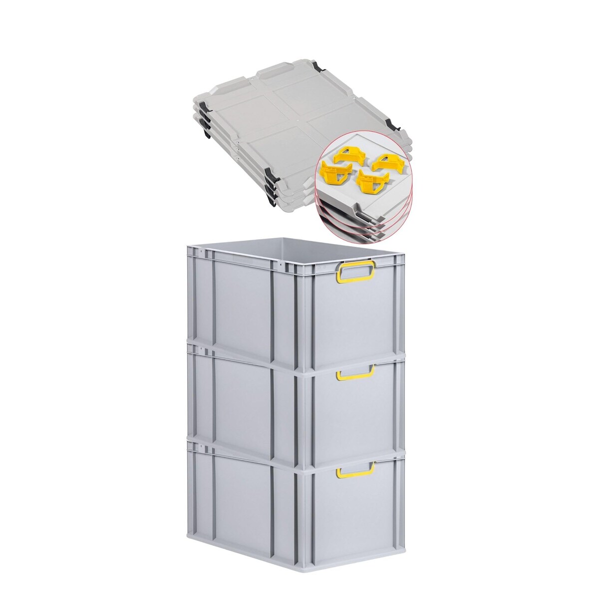 PROREGAL SparSet 5x Eurobox NextGen Economy mit Auflagedeckel & 4x Verschlüsse Gelb, Griffe zu, HxBxT 32x40x60cm, 65L, Eurobehälter, Box