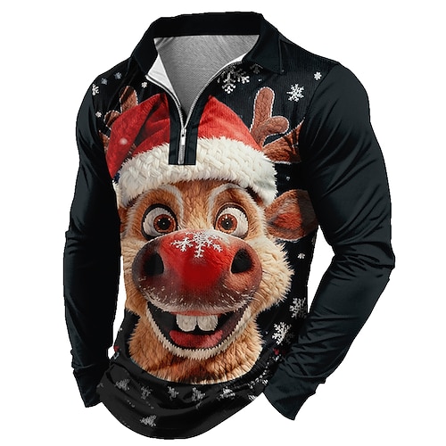 Natale Per uomo Ogni Fantasia Cartone 3D Polo Manica Lunga Magliette polo Bavero Casual Abbigliamento quotidiano Abito da festa Stampa 3D Polo con cerniera a un quarto Primavera Autunno Inverno Blu