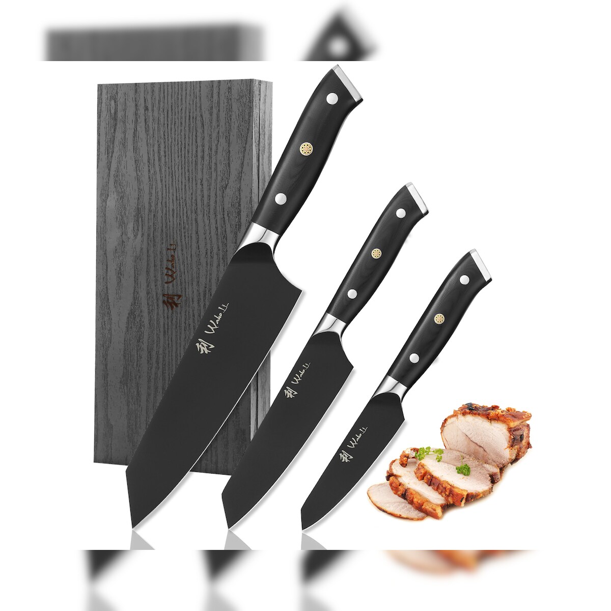 Wakoli Titanium Noir 3er Set mit 8-17cm Klingen, G10 Griff, in Holzbox, Küchenmesserset & Profi Kochmesser