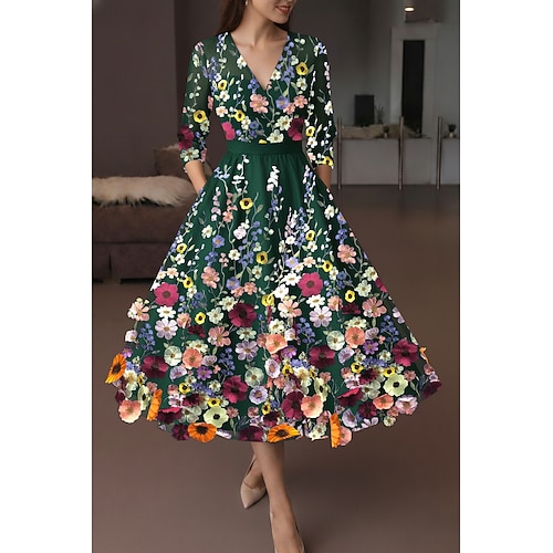 Linea ad A Lunghezza Tè Abiti da Cocktail Elegante Vintage Floreale Mezza Manica Scollo a V Festa in giardino Matrimonio Tasca Raso Pizzo con Fiore ricamato Ricamo Tasca