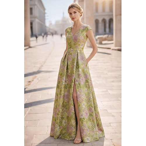 Linea ad A Lunghezza alla caviglia Abiti da Cocktail Elegante Floreale Manica Corta Scollo a V Festa in giardino Matrimonio Tasca Jacquard con Stampa floreale Pieghe Tasca