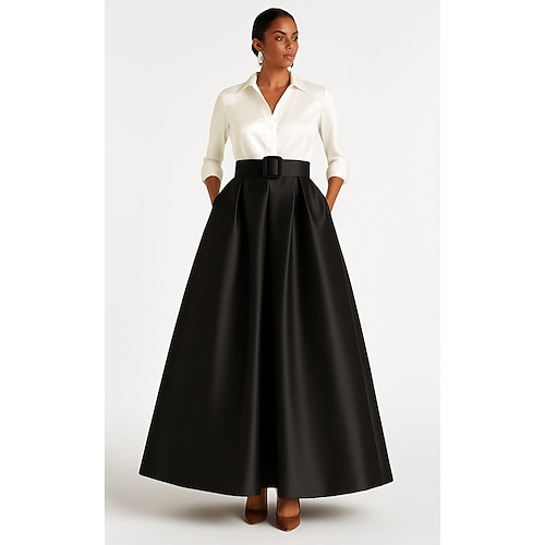 Abito da sera A-Line bianco e nero elegante abito formale per matrimonio lungo fino al pavimento manica a 3/4 colletto a camicia raso elasticizzato con pieghe