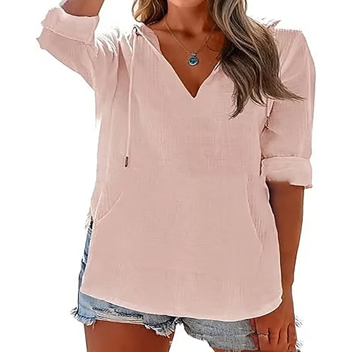 Per donna Blusa 100% cotone Semplice Elegante Vintage Manica Lunga Scollo a V Top Regolari Quotidiano Ferie Uscire Patchwork Tasca Nero Bianco Rosa Blu marino Arancione Estate Primavera
