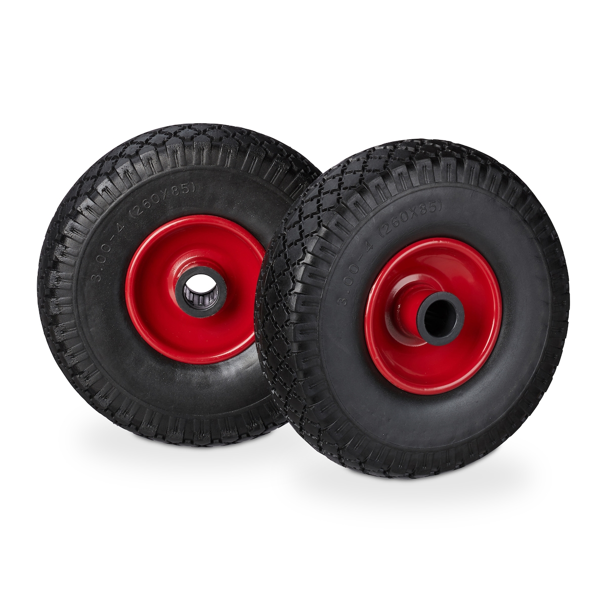 Relaxdays Sackkarrenrad Set, pannensicher, 3.00-4 Vollgummireifen, Stahlfelge, 25mm Achse, 100 kg, 260x85mm, schwarz-rot