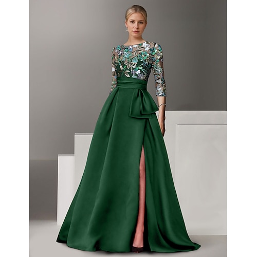 Abito da Sera A-Line Ricamato Floreale Elegante Formale Matrimonio Lungo Fino al Pavimento Mezza Manica Collo a Camicia di Satin con Fiocco(e) Spacco