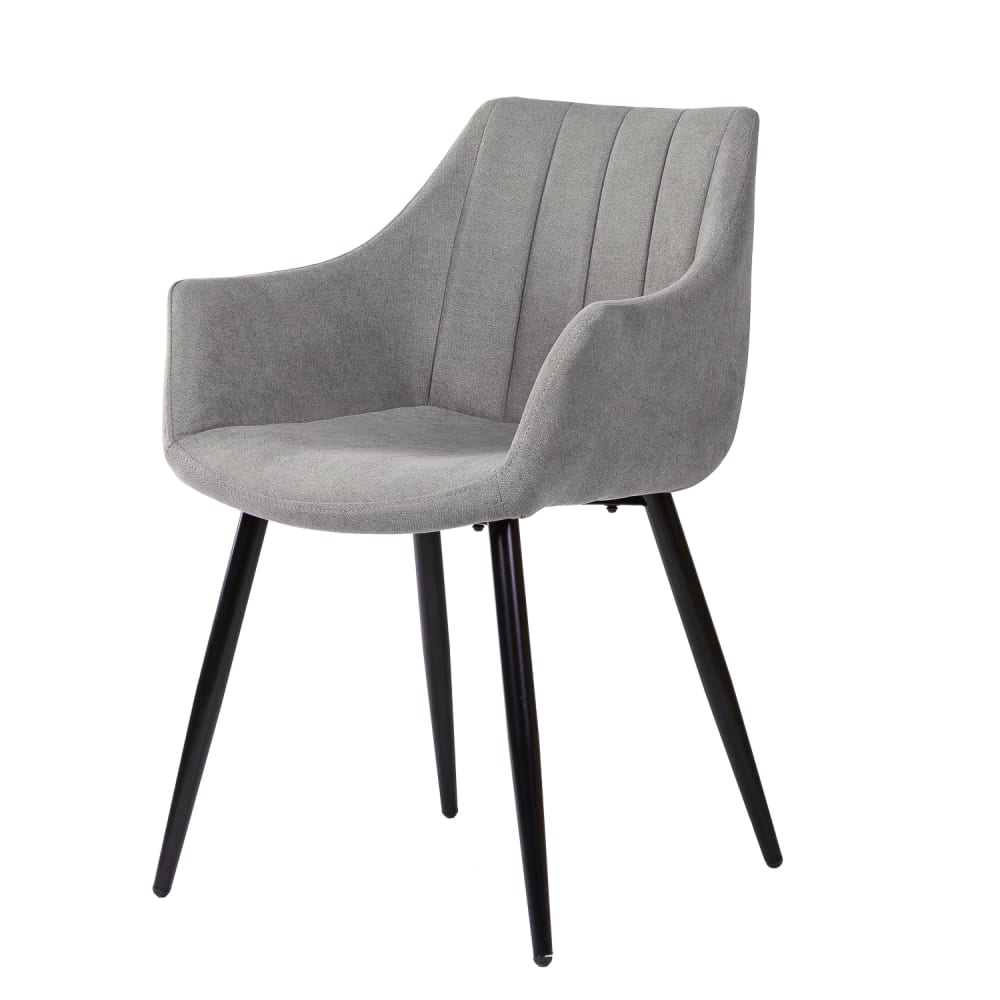 Sedia con braccioli, gambe nere e seduta in grigio chiaro.
