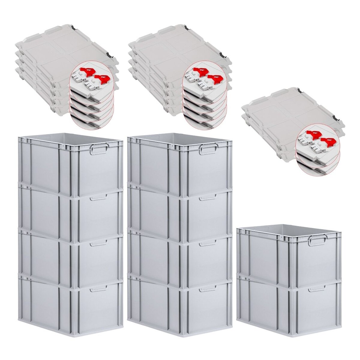 PROREGAL 10x Eurobox NextGen Grip mit Scharnierdeckel & roten Verschlüssen | HxBxT 32x40x60cm | 65 Liter | Griffe geschlossen | Verstärkter Boden