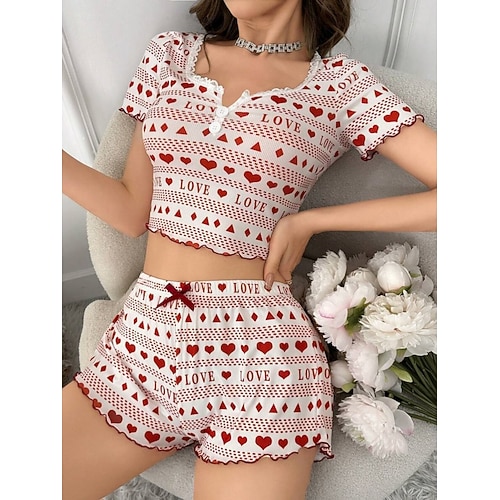 Per donna Set Pigiama Casual Comfort Cuore Elastico in vita Shorts Quotidiano Casa Manica Corta Scollo a V Nero Rosso Estate Primavera Vestibilità aderente