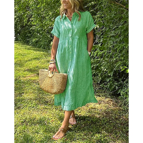 Per donna Abito Midi Abito Bianco Abito in cotone e lino Abito Elegante Elegante Vintage Moda Quotidiano All'aperto Vacanza Vestibilità comoda Semplice A righe Manica Corta Colletto a Camicia Blu