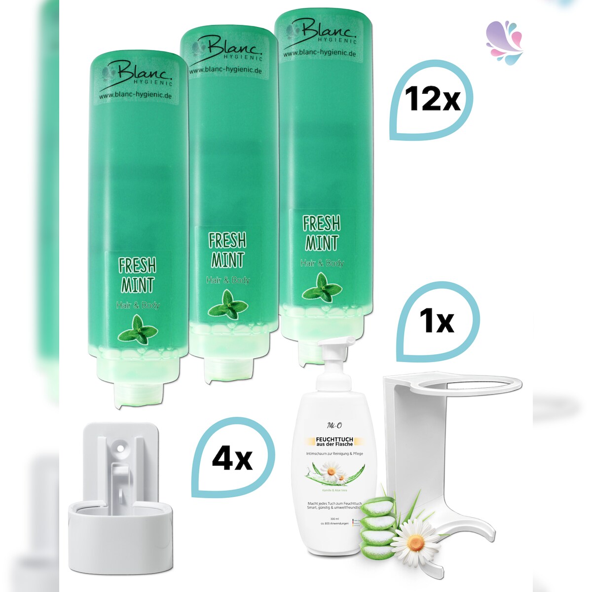 Blanc HYGIENIC KOMPLETT-SET Duscherlebnis 12x425ml verschied. Düfte, 1x300ml Intim Reinigungsschaum+ 5x Wandhalterung : Duftnote - Fresh Mint: Minze, Teebaum, Farbe