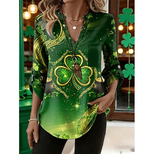 San Patrizio Per donna Blusa Grafico Trifoglio Elegante Vintage Casual Manica Lunga Scollo a V Top lunghi Quotidiano Lavoro Arricciato Giallo Verde Estate Primavera