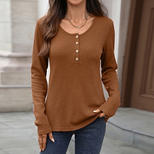 Maglietta da donna a girocollo in maglia waffle, manica lunga, con bottoni, elegante, classica, casual, nera, blu polvere, viola, marrone, beige chiaro, per autunno inverno, tutti i giorni, per uscire, weekend
