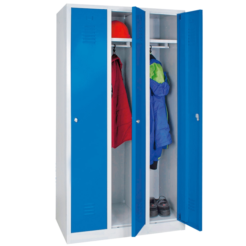 BRB Kleiderspind mit Sockel, 3 Abteile á 300 mm, HxBxT 1800 x 900 x 500 mm, lichtgrau/blau