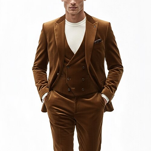 Uomo Affari Casuale Abito di velluto Bavero a lancia Nero Borgogna Moda Quotidiano Tinta unita Vestibilità su misura 3 pezzi Doppiopetto a sei bottoni