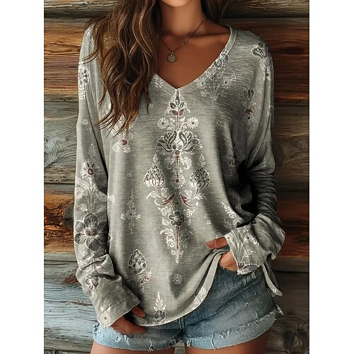 Per donna Maglietta Grafico Piante Tribale Vintage Elegante Classico Manica Lunga Scollo a V Top Regolari Quotidiano Stampato Blu Verde chiaro Vino Blu marino Fucsia Primavera Autunno Inverno