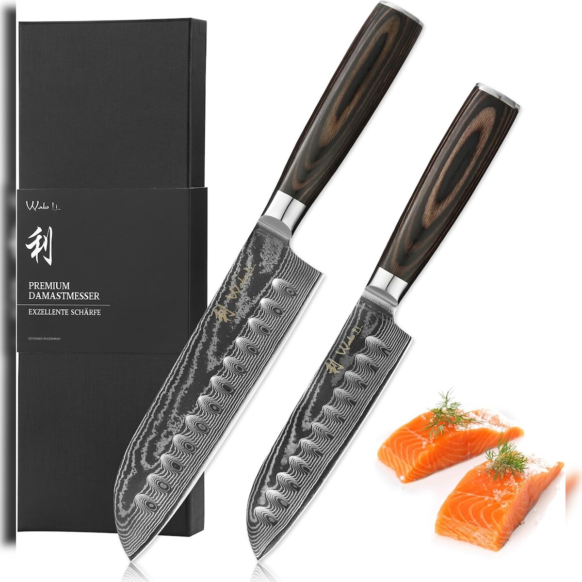 Wakoli EDIB Essentials 2er Damastmesser Santoku Messer-Set - 12cm & 18cm I Profi Küchenmesser aus 67 Lagen Damaststahl - Pakkaholzgriff - Inklusive