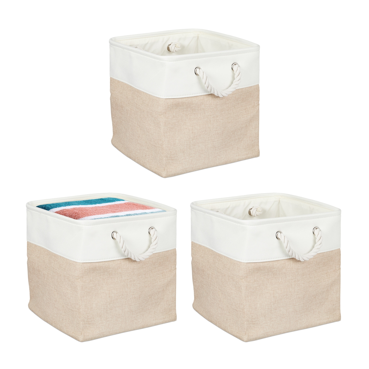Relaxdays Aufbewahrungskorb, 3er Set, Leinen, mit Seilgriffen, Kleidung, Spielzeug, 30x30x30 cm, Regalkorb, beige/weiß