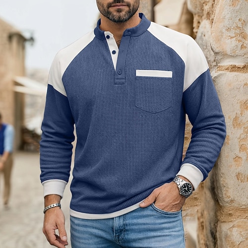 Per uomo Maglietta Waffle Maglietta Manica Lunga Henley Autunno Autunno Inverno Tutte le stagioni Tinta unica Testurizzato Tradizionale / Vintage Casual Patchwork Casuale Casa All'aperto Blu chiaro