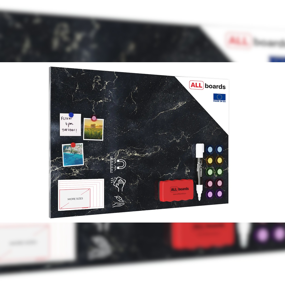 ALLboards Metallische Magnettafel SCHWARZER MARMOR 90x60cm Memoboard für jede Art von Magneten Magnetpinnwand + Marker, 10 Magnete und Schwamm