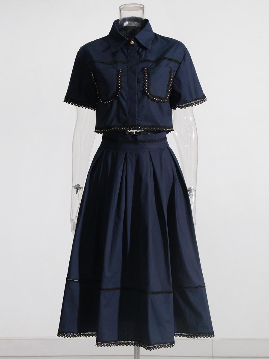 Women's Lace Embroidered Lapel Top & High-Waist Mid-Length Skirt Set (2025 Summer) cm navy blue