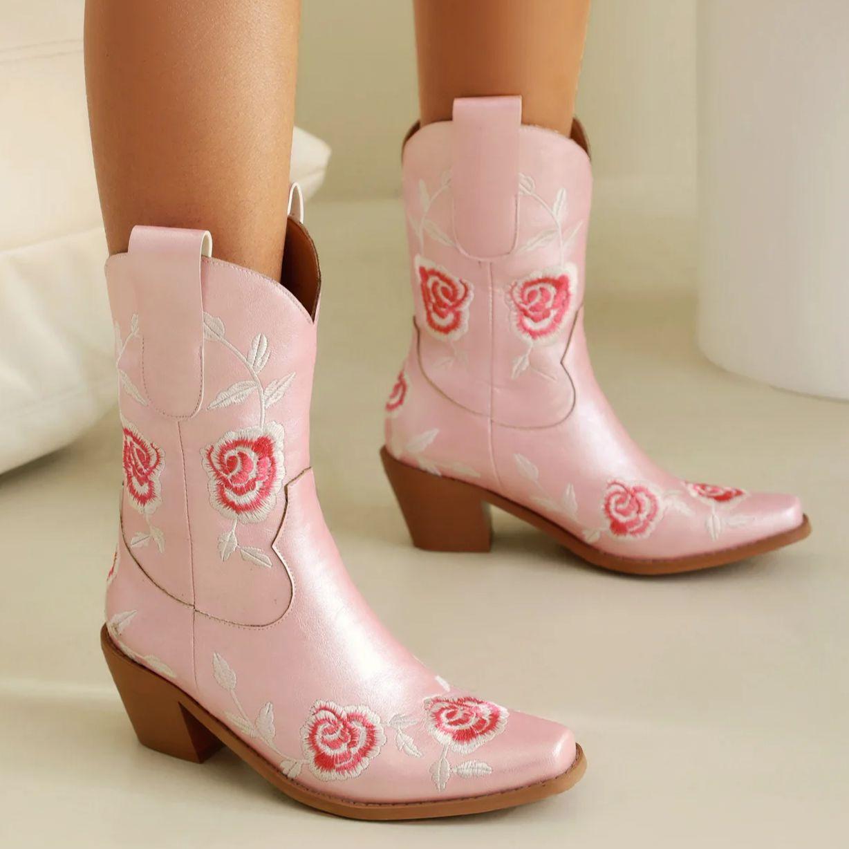 Women's Retro Cowboy Boots Anti-Slip Mid Calf Cowgirl Boots Embroidered Western Pointed Toe Chunky Block Heel Wide Calf Pull On Boots for Women cm bla