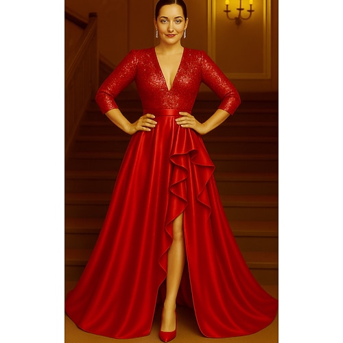 Linea ad A Lunghezza al pavimento Abito da Sera Da principessa Abito formale Elegante Vintage Setoso Manica 3/4 Scollo a V Matrimonio Formale Tasca Raso Elasticizzato con Volant