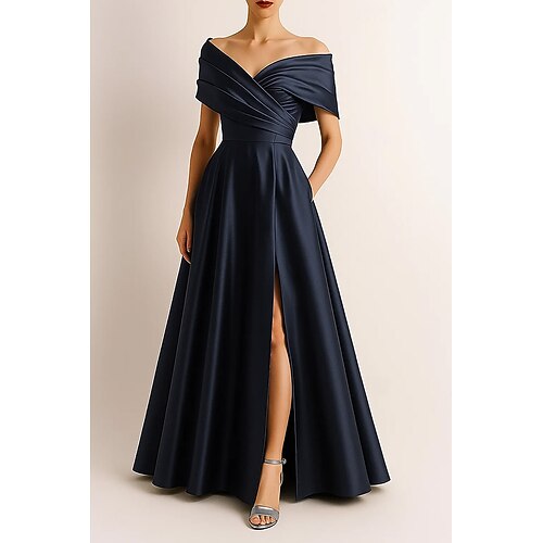 Linea ad A Lunghezza al pavimento Abito da Sera Da principessa Abito formale Elegante Manica 3/4 Senza Spalle Matrimonio Formale Tasca Raso Elasticizzato con Arricciato
