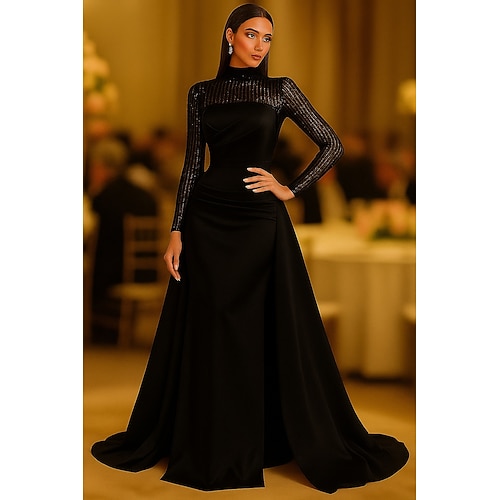 Linea ad A Lunghezza al pavimento Abito da Sera Abito da ballo con sopragonna Elegante Scintillante Manica Lunga Collo Alto Matrimonio Formale Tasca Raso Con Paillettes con Glitter Pieghe