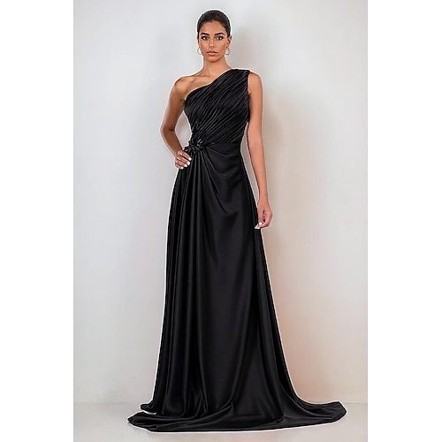 Linea ad A Strascico a Terra Abito da Sera Da principessa Abito formale Elegante Setoso Senza Maniche Monospalla Matrimonio Formale Raso con Fiori 3D Pieghe